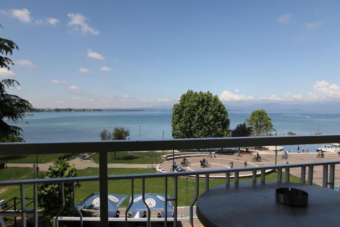 Camera matrimoniale / letti singoli con vista diretta sul Lago di Garda e dotata di piccolo balcone privato al secondo piano della struttura principale.