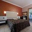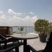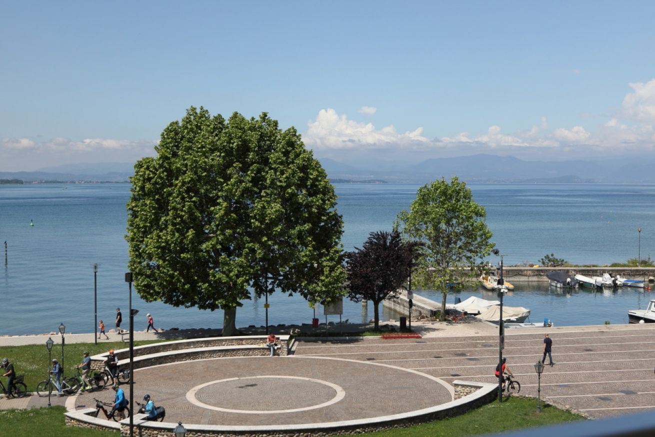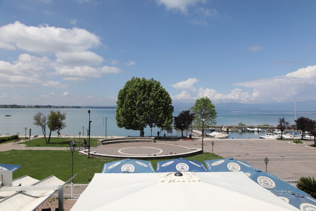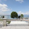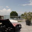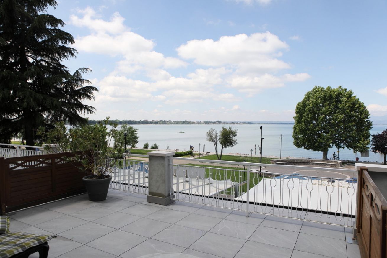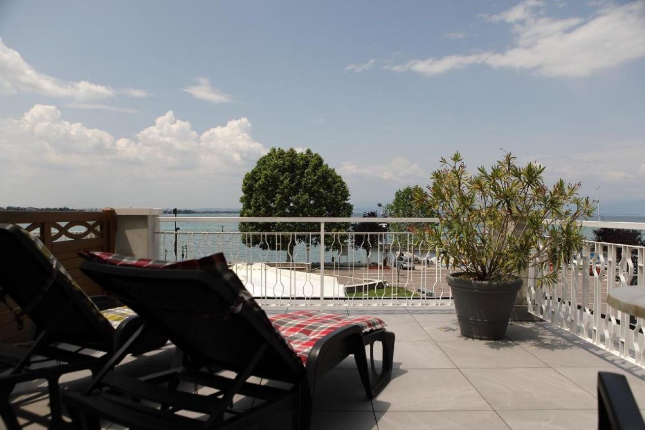 Camera matrimoniale con vista diretta sul Lago di Garda , dotata di ampio terrazzo con sdraie e tavolino al primo piano della struttura principale.